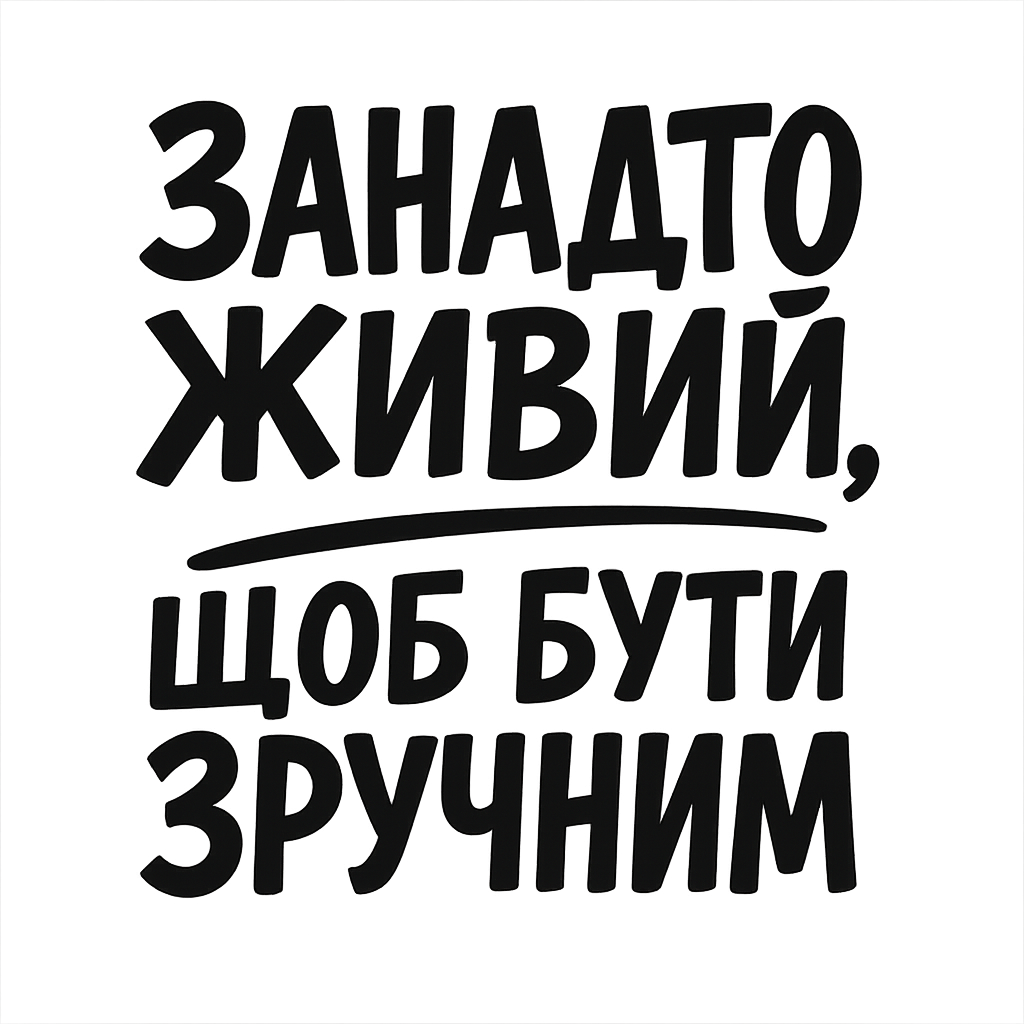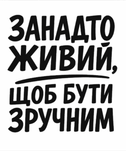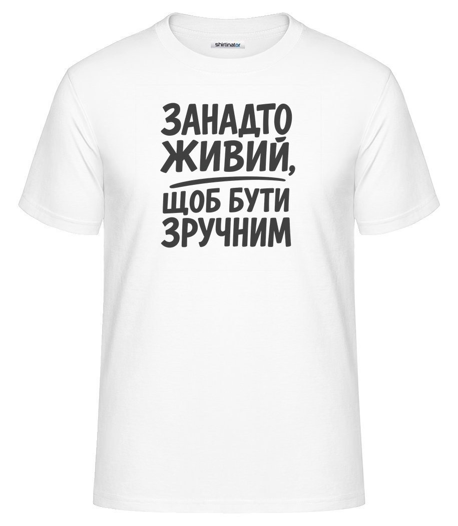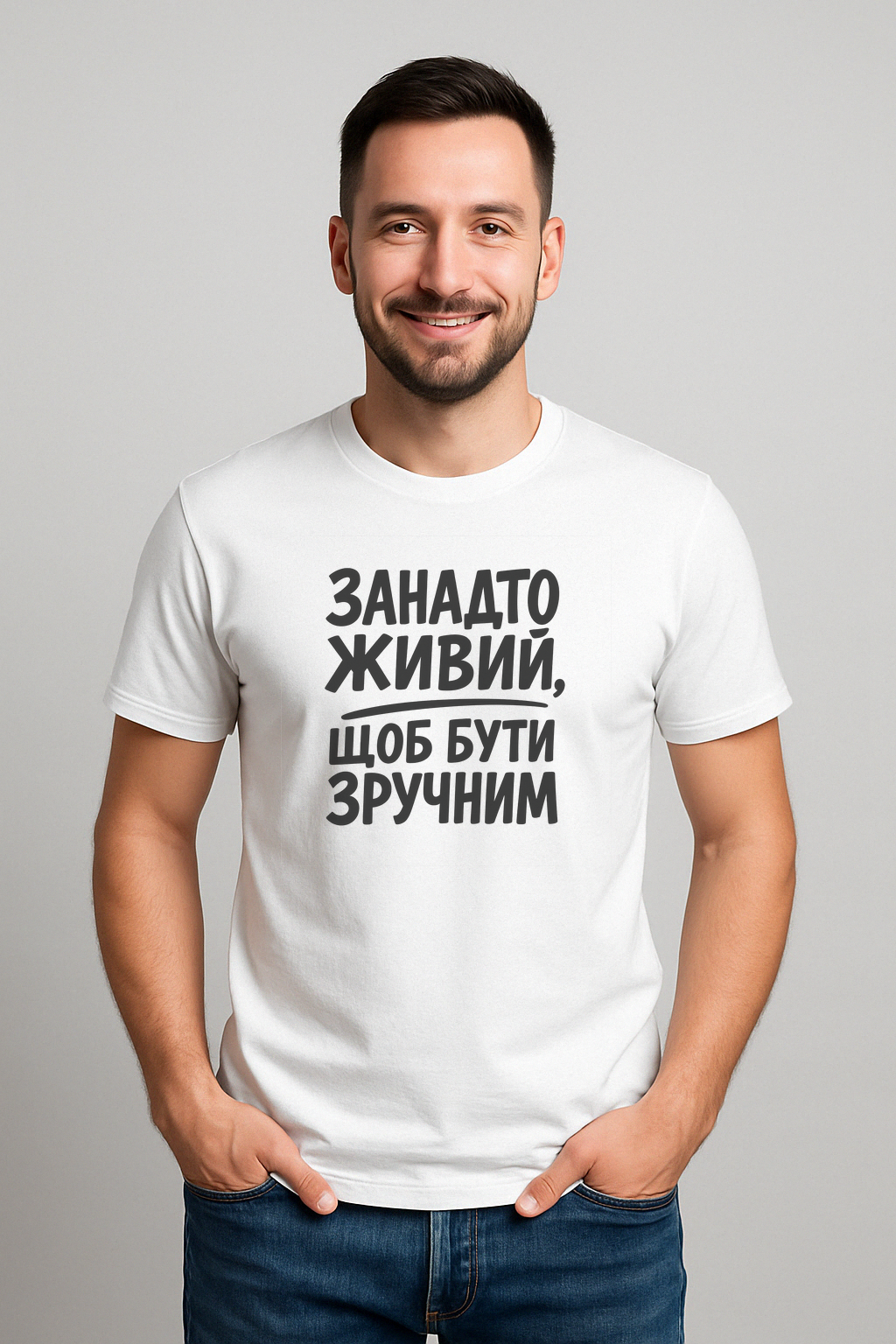 Футболка чоловіча “Футболка чоловіча «Занадто живий…»” – це більше, ніж просто одяг. Це – виклик, маніфест, заява про незривну готовність цього чоловіка наважуватись, відчувати та пізнавати. Та й взагалі, усмішка на обличчях перехожих та знайомих гарантована.