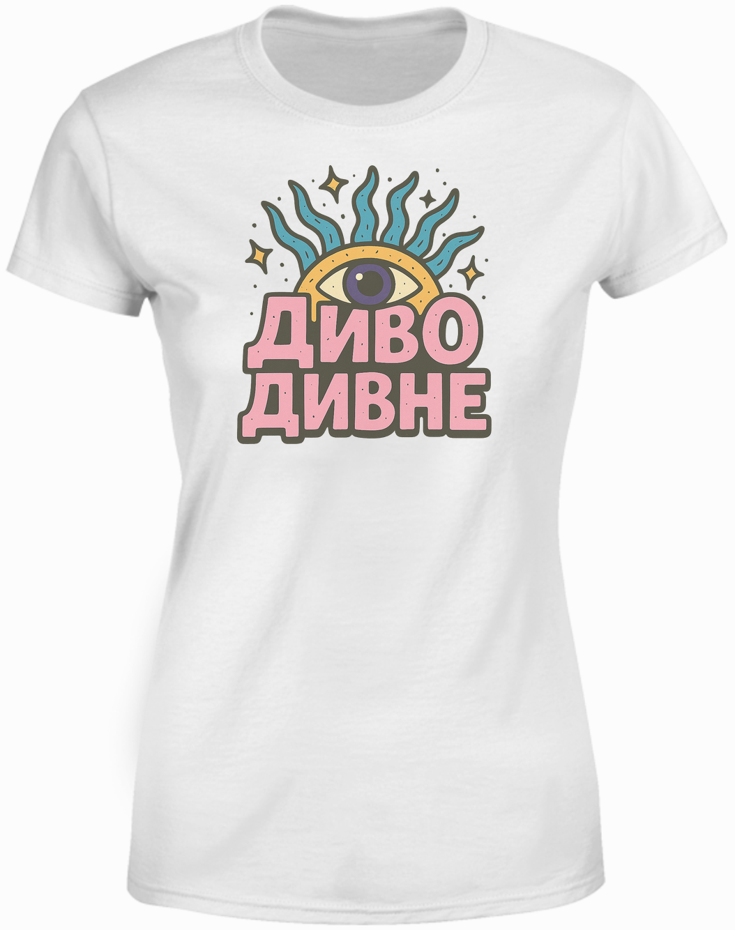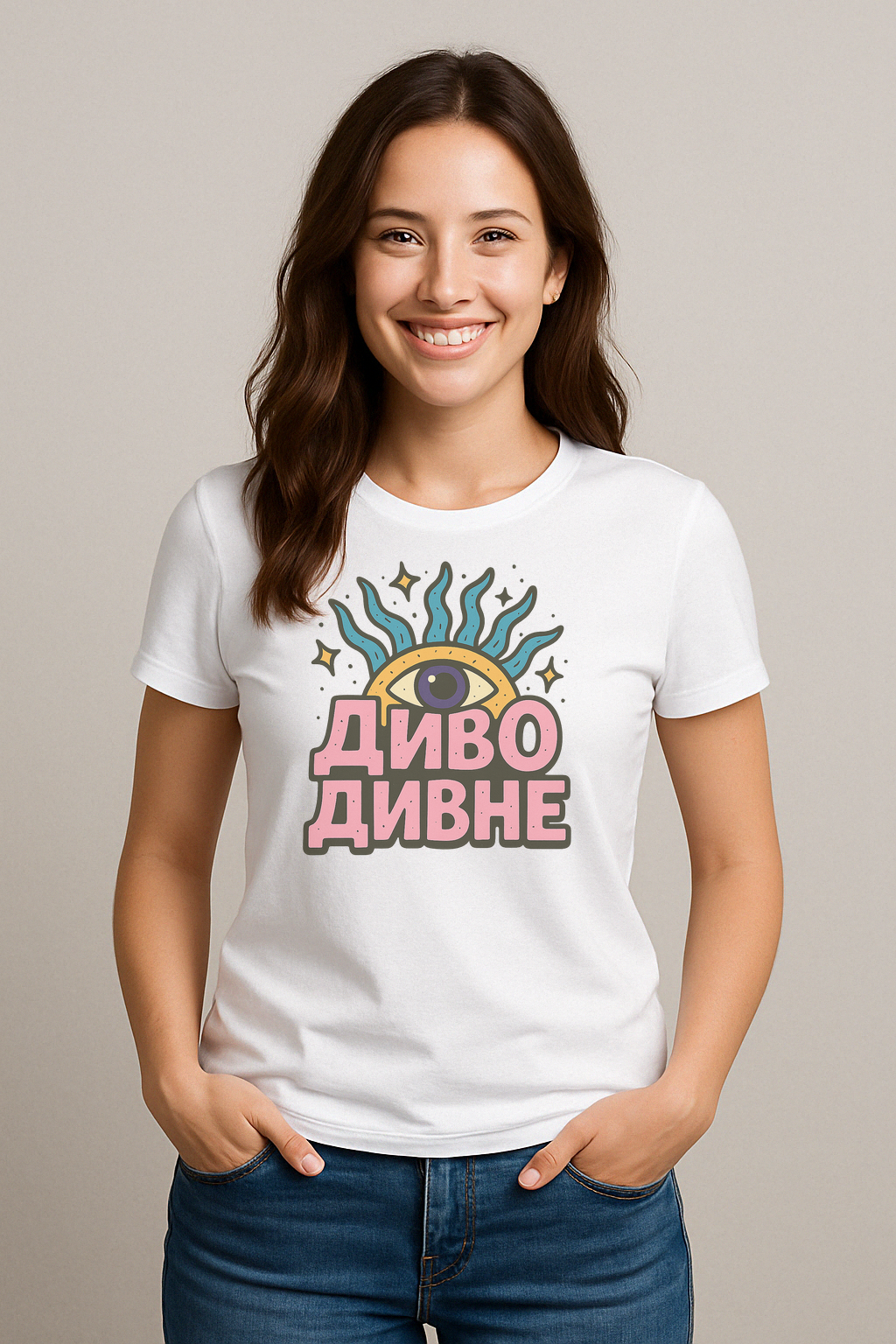 3. Універсальний білий колір з особливим принтом «Футболка жіноча «Диво -Дивне»”.