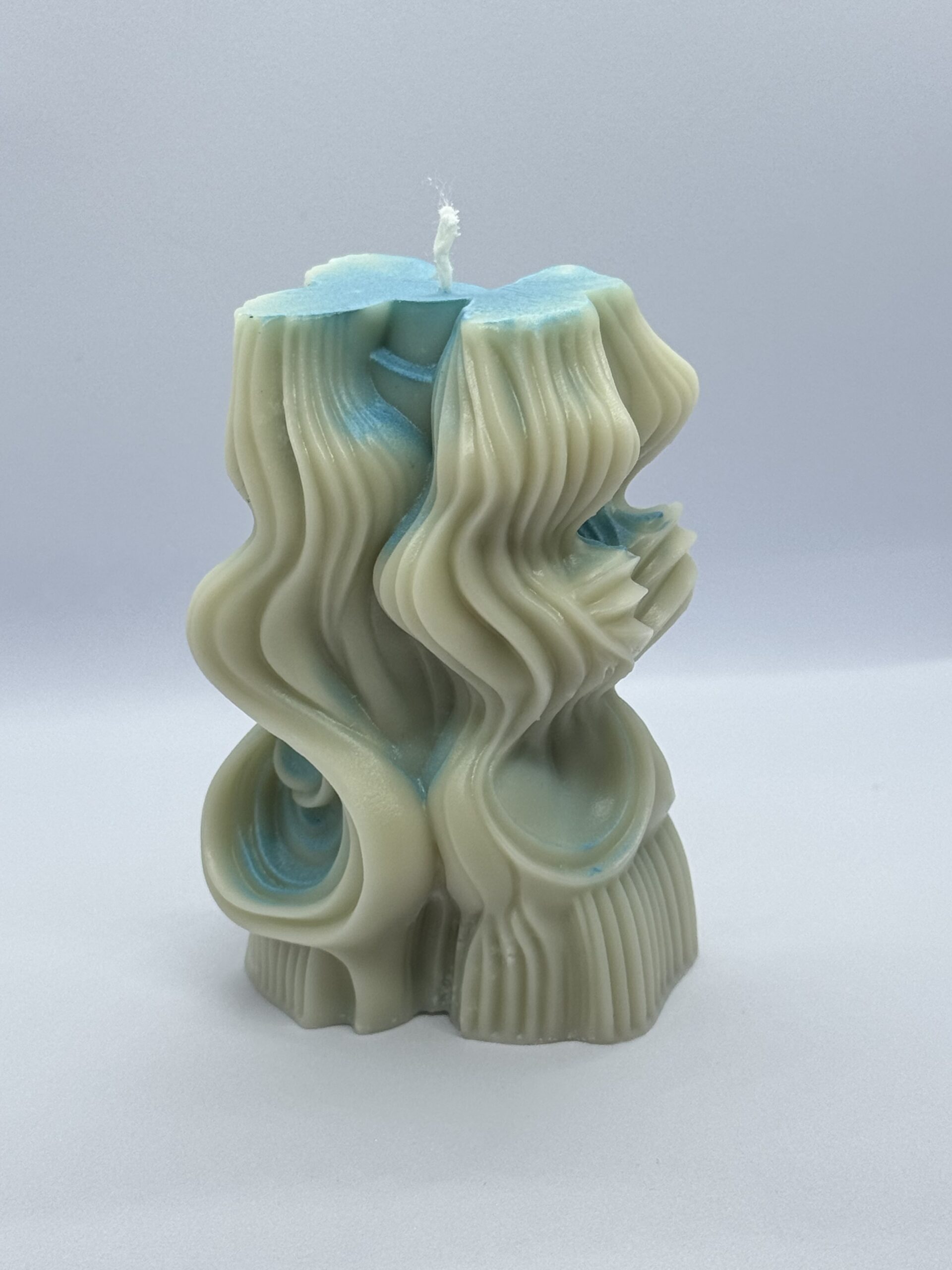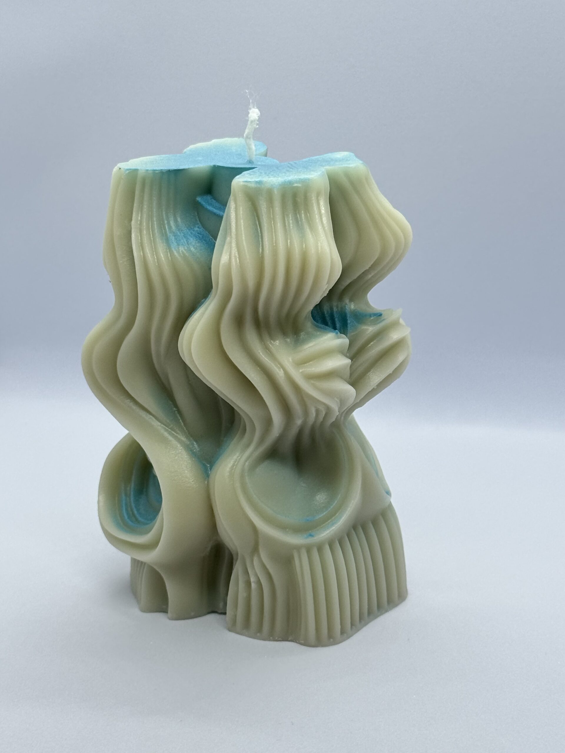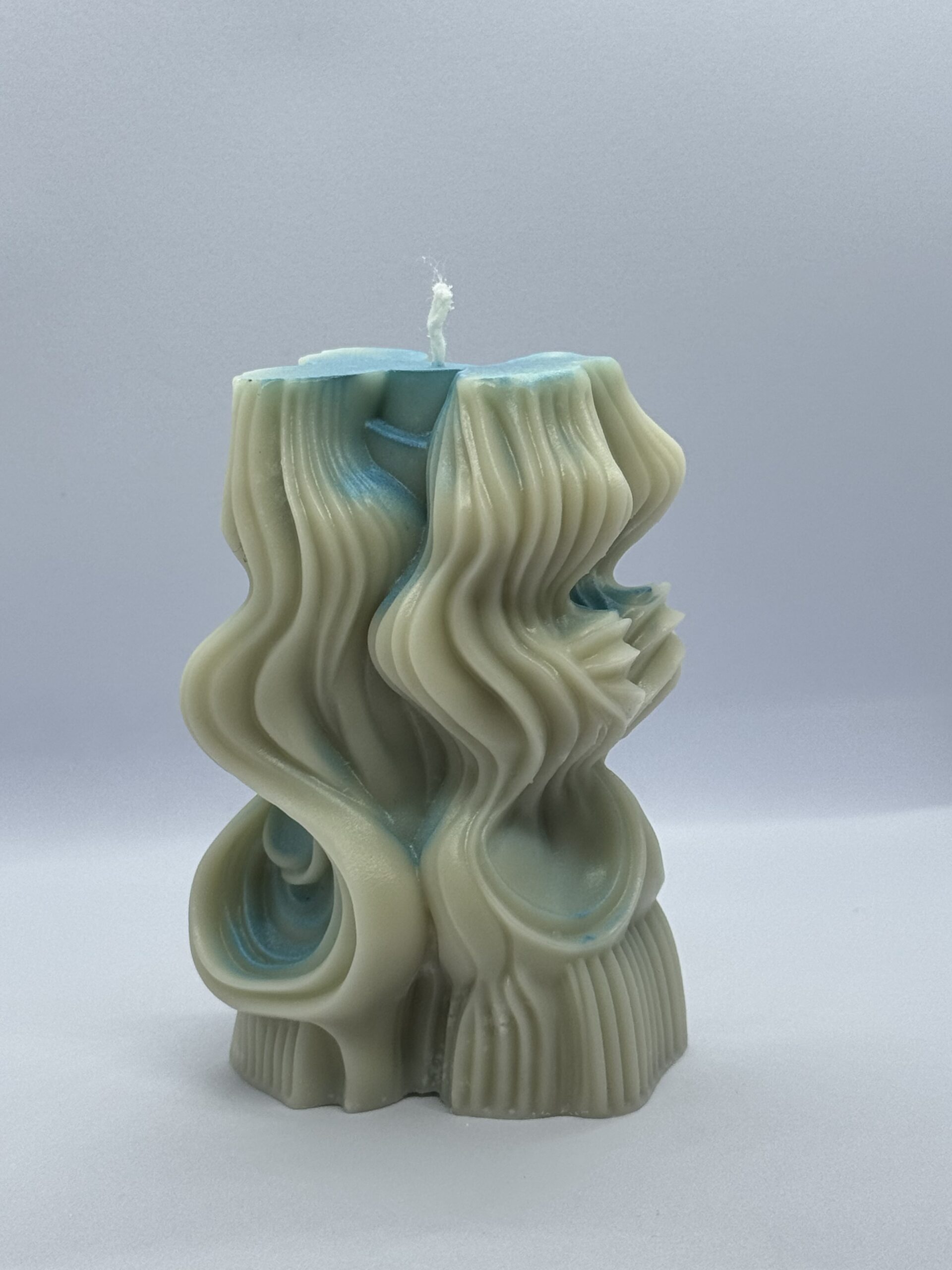 Ця неймовірна свічка наче з іншого виміру. Її м’які, пульсуючі хвилі формують живу скульптуру, у якій застиг рух енергії. Світло-бежеві й небесно-блакитні переливи створюють ефект глибини, спокою та безмежності.