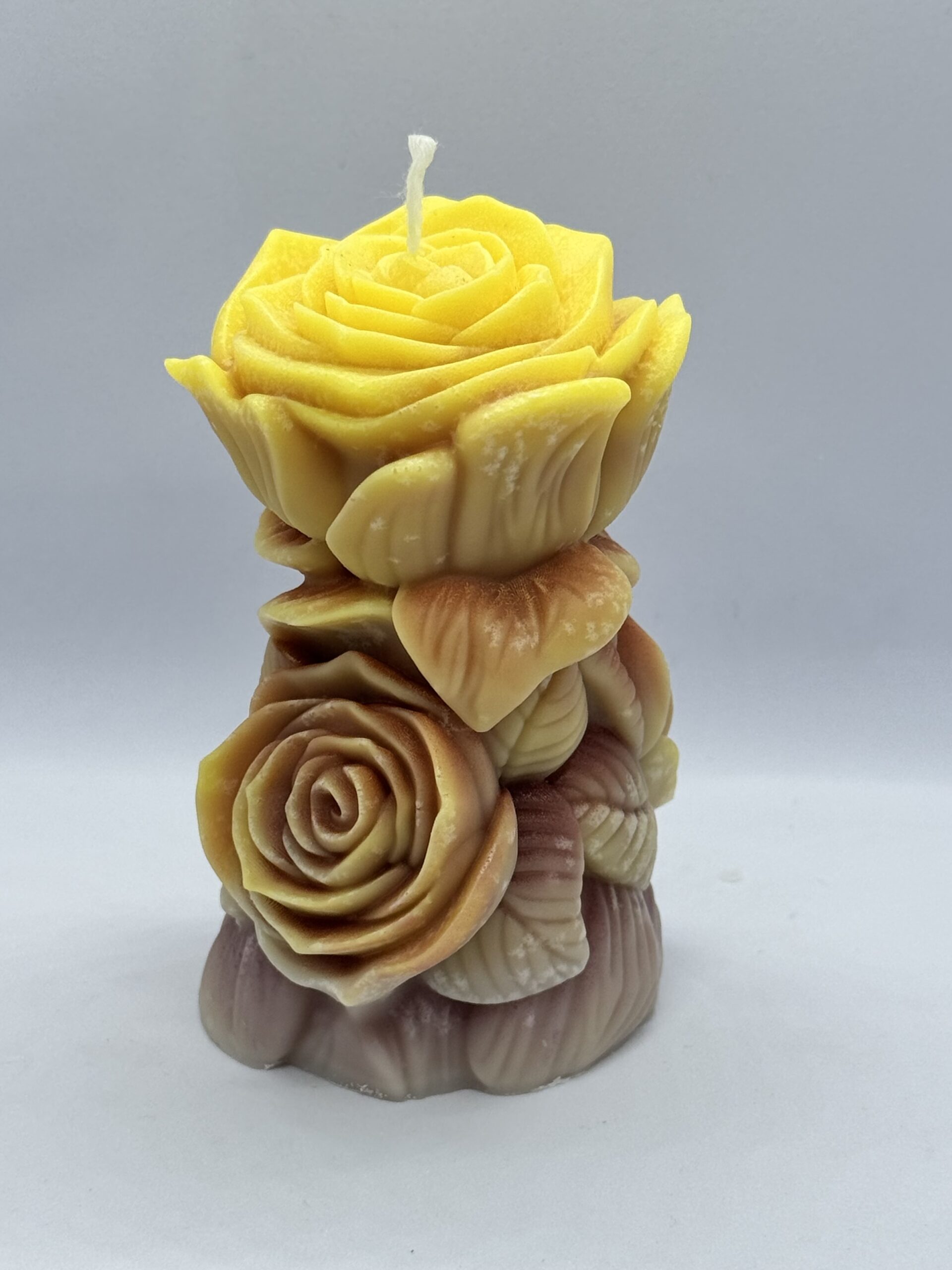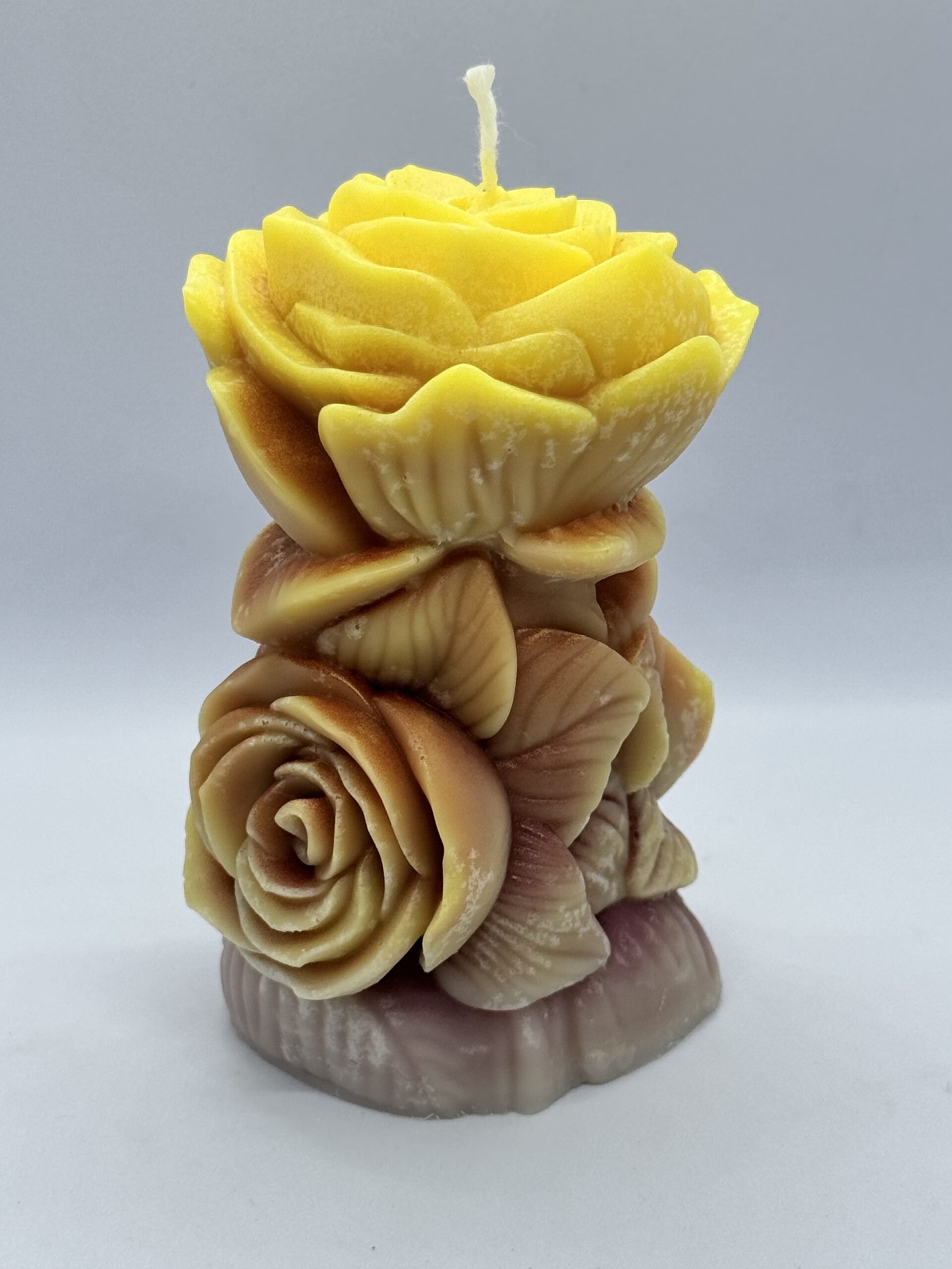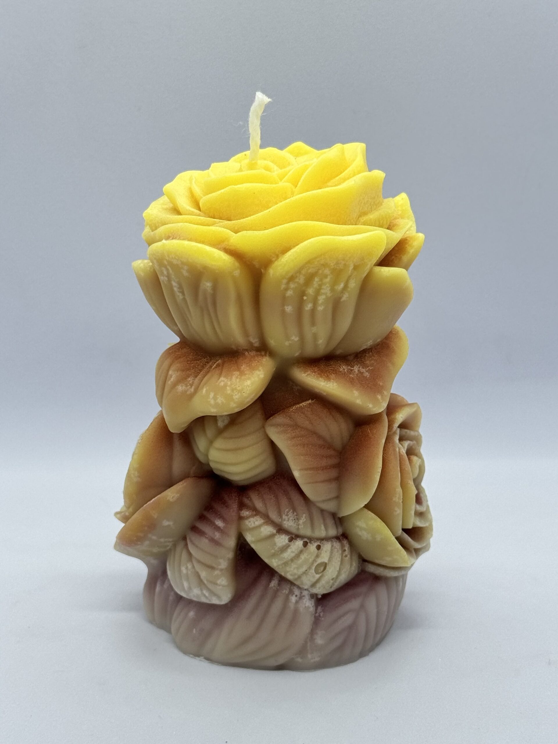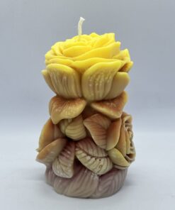 Ніжна, тепла, жива. Ця свічка — справжня скульптура з ароматом сонця. Кожна пелюстка мов виткана з любові, турботи та світла, що живе всередині кожного з нас. Вона поєднує у собі кольори землі й сонця — жовтий, кремовий, теракотовий — створюючи ефект багатошарової, об’ємної троянди, яка ніколи не зів’яне.