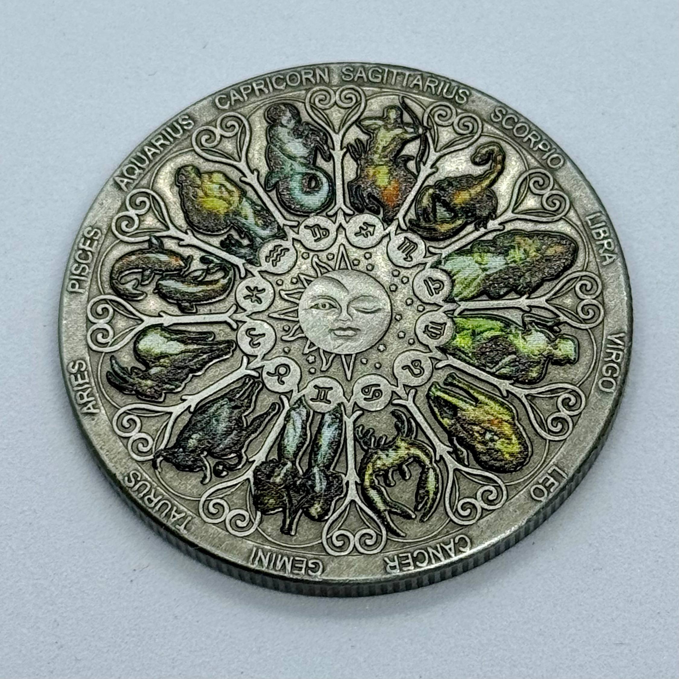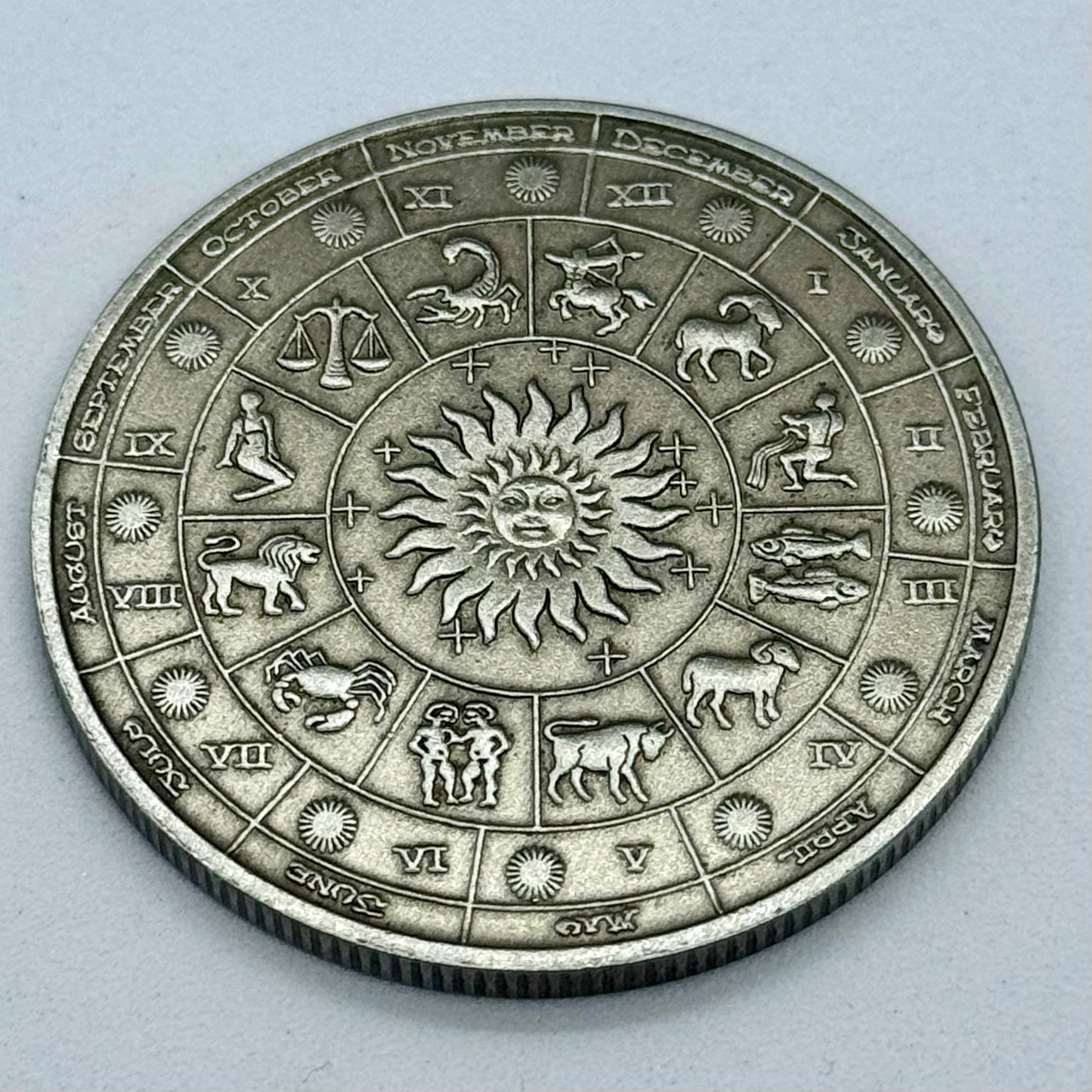 Зодіакальне Колесо Часу — це сакральна монета, що уособлює вічний ритм космосу, нерозривний цикл життя, таємниці часу й вплив небесних сил на долю людини. Це артефакт, який не просто зображає астрологічні знаки — він втілює саму структуру Всесвіту.